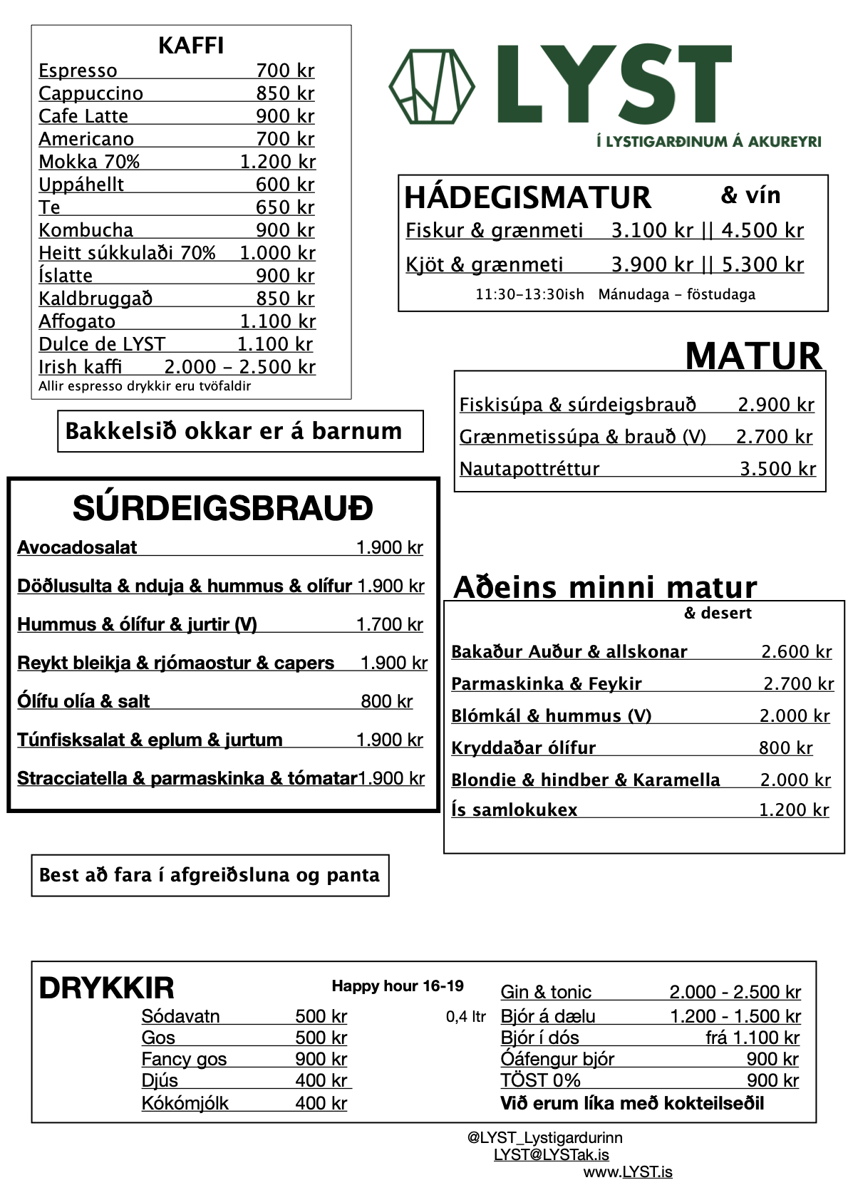 LYST í Lystigarðinum Mánudaga til fimmtudaga 10:00-21:00 Föstudaga 10:00-23:00 ish Laugardaga 10:00-23:00ish Sunnudaga 10:00-19:00 Kaffi LYST í pennanum Eymundsson 08:00-18:00 alla daga
